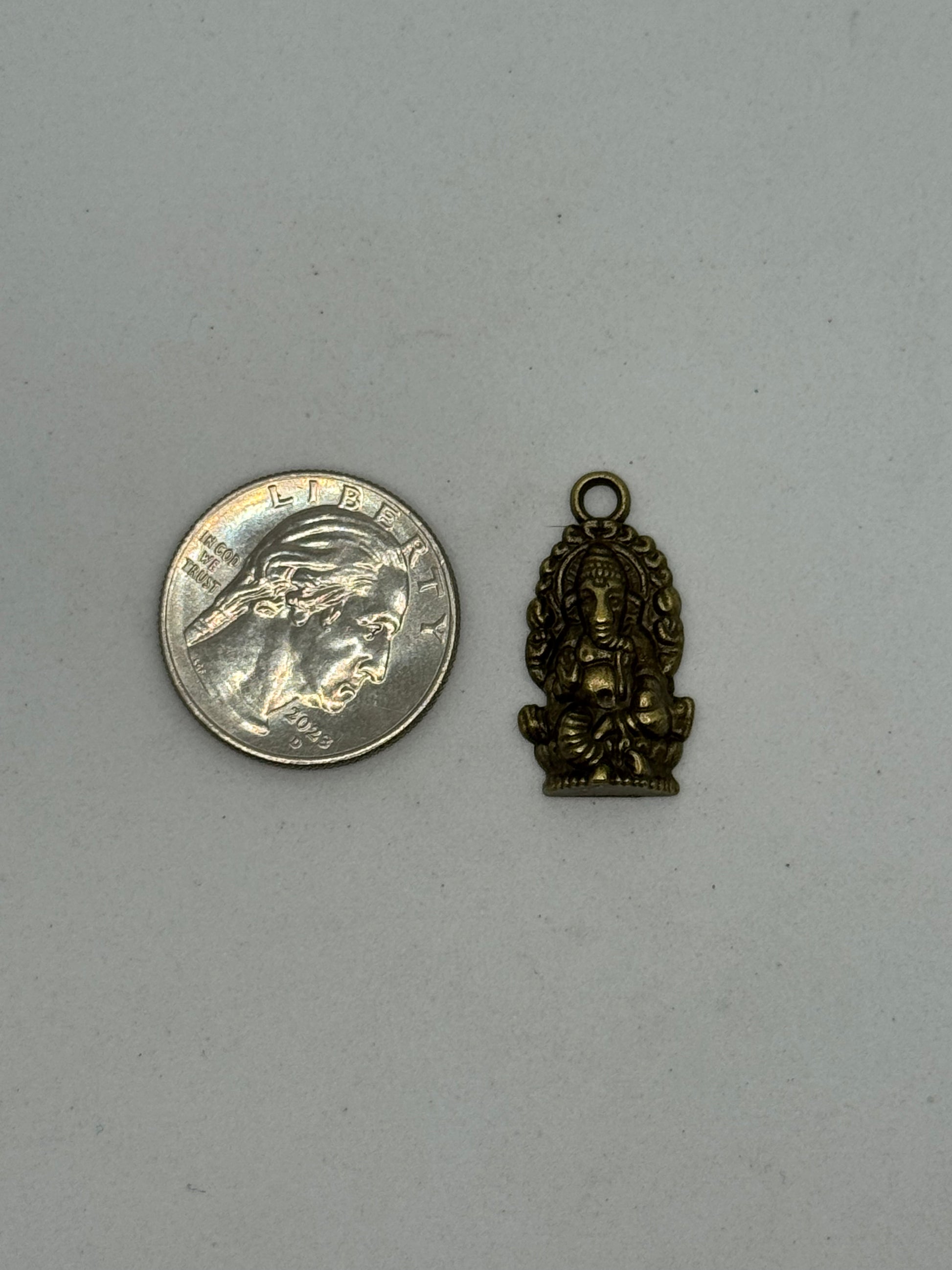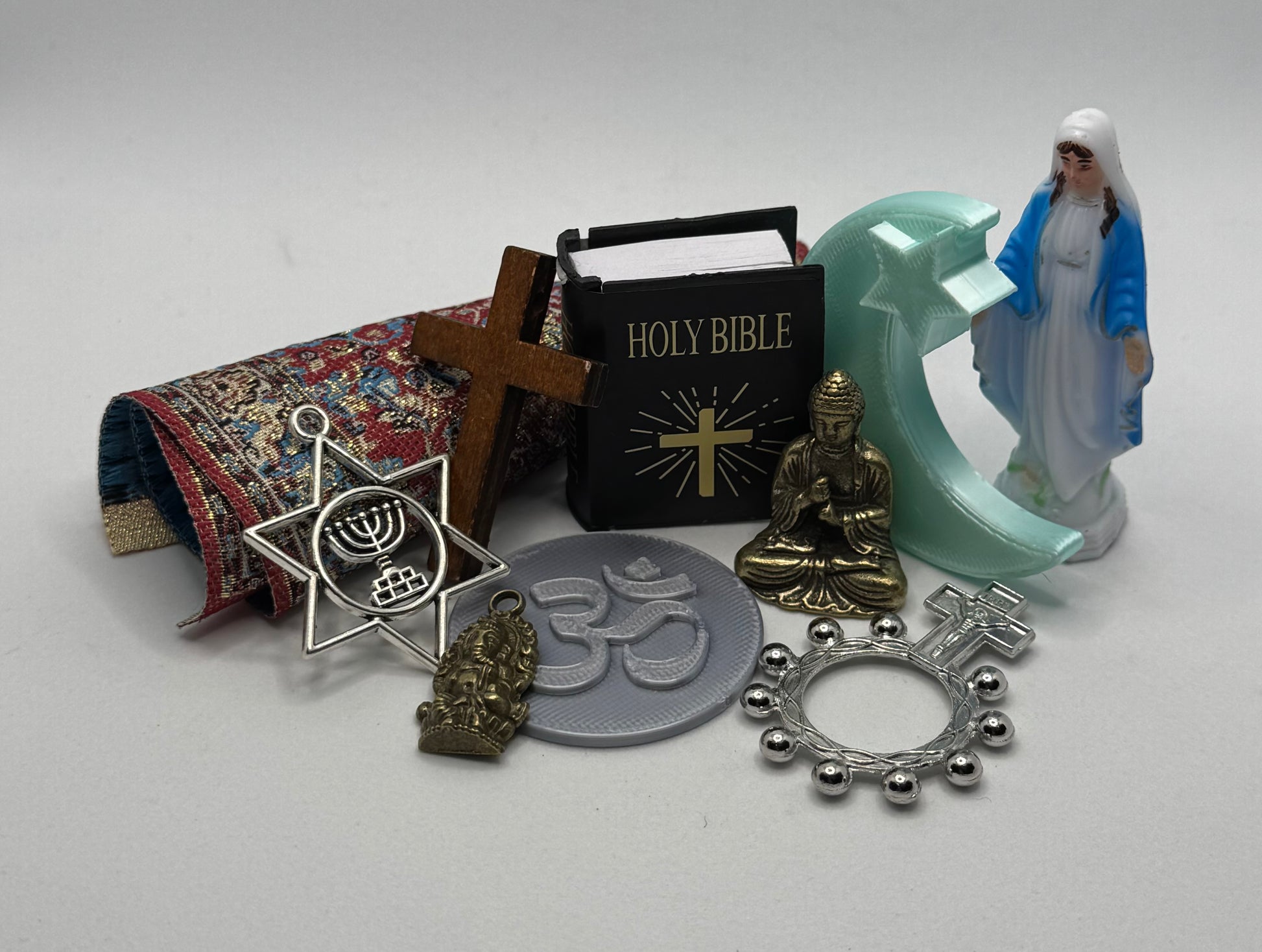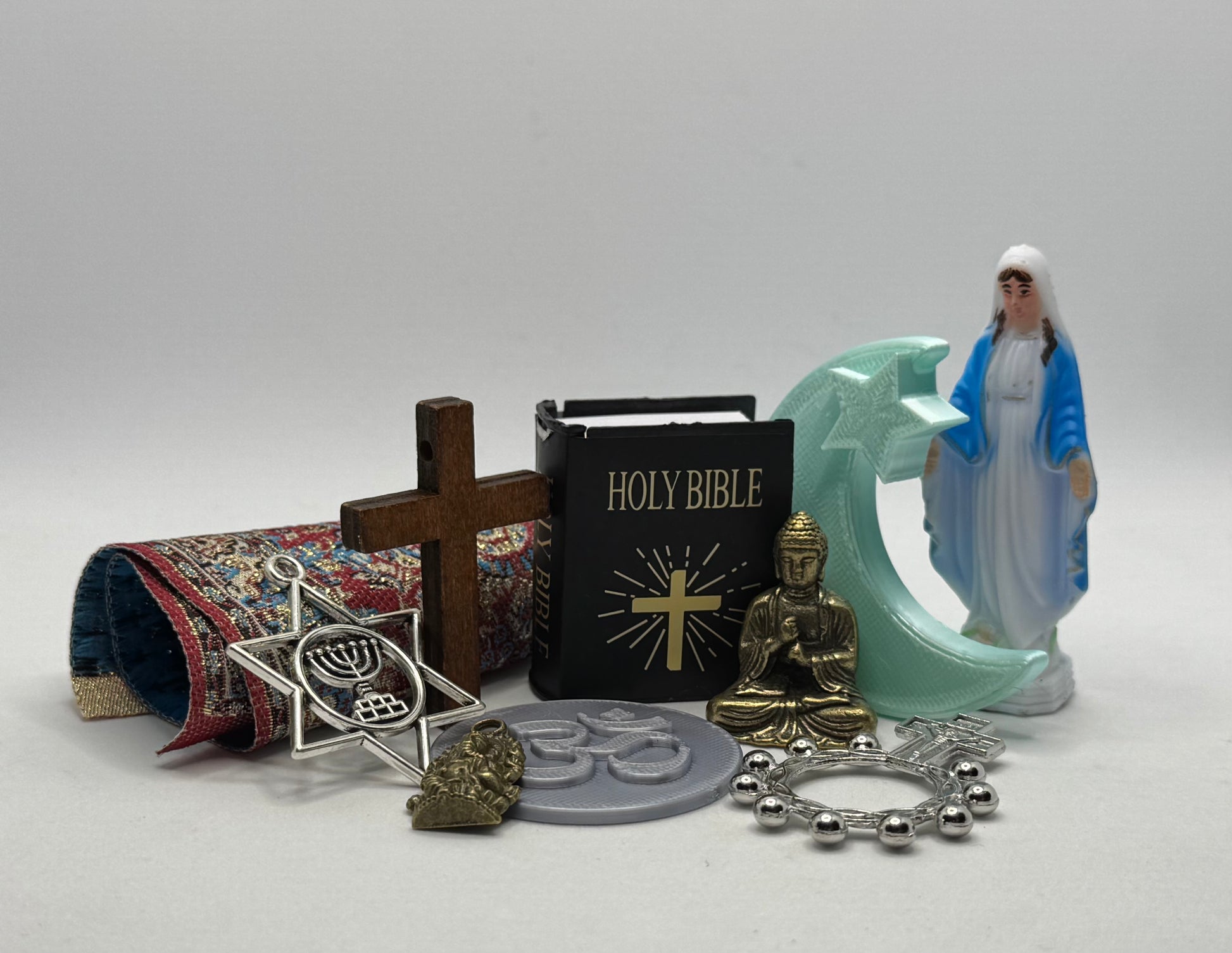 Current Items included are wooden cross, bible, Mother Mary, Buddha, Rosary Ring, Star of David/Menorah, Ohm Coin, Prayer Rug, Crescent Moon (hilal), and Hindu God - Ganesha